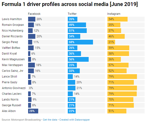 As new drivers enter the sport, it is interesting to note how the skew for each driver moves increasingly towards Instagram and away from Facebook and Twitter. For example, 50.8 percent of Nico Hulkenberg’s following comes from Twitter, compared with 13.8 percent for Charles Leclerc. In contrast, 37.0 percent for Hulkenberg is Instagram related, versus 78.9 percent for Leclerc.