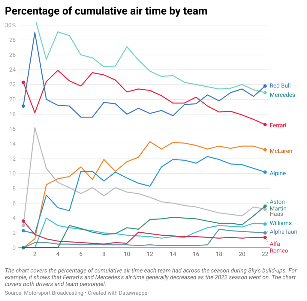 Analysis from Motorsport Broadcasting suggests that Sky were eight times more likely to feature the top teams compared to the bottom teams during the 2022 season. Again, this largely consists of material pre-prepared by the production team, such as an extended interview off site.
