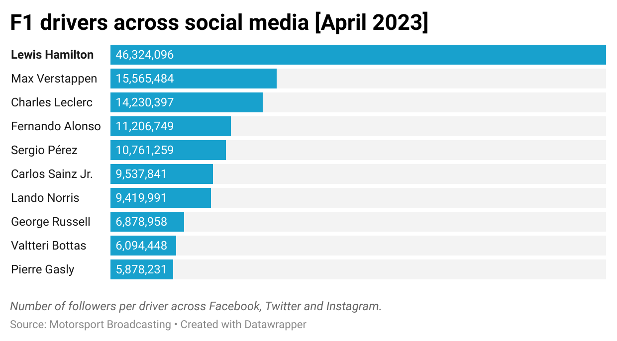 Marquez has 3.84 times more followers compared to MotoGP’s next best, while Hamilton has 2.92 times more followers than the second most followed F1 driver, showing how their on-track performances have perforated through onto social media.