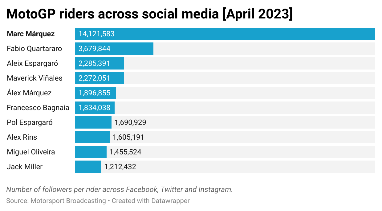Analysis by Motorsport Broadcasting shows that Marquez is to MotoGP what Lewis Hamilton is to Formula 1 from a social media perspective, across Facebook, Twitter, and Instagram.