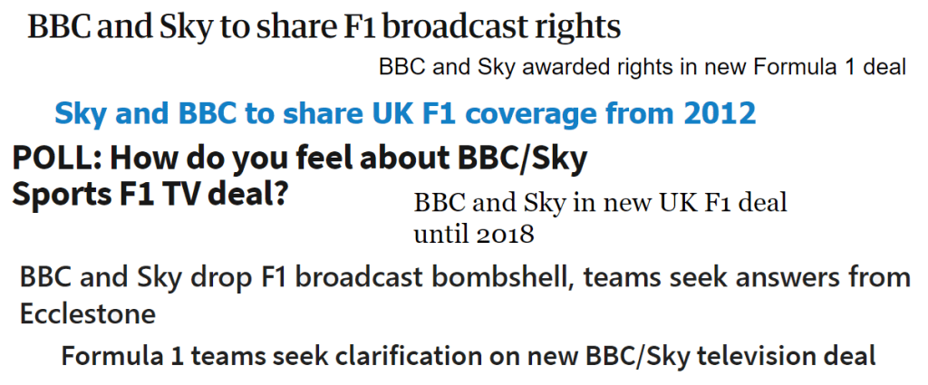 Some of the headlines following the announcement of the BBC and Sky Sports F1 deal in 2011. Headlines from The Guardian, BBC, RaceFans.net, Crash.net, Adam Cooper’s blog, Motorsport.com and Autosport.