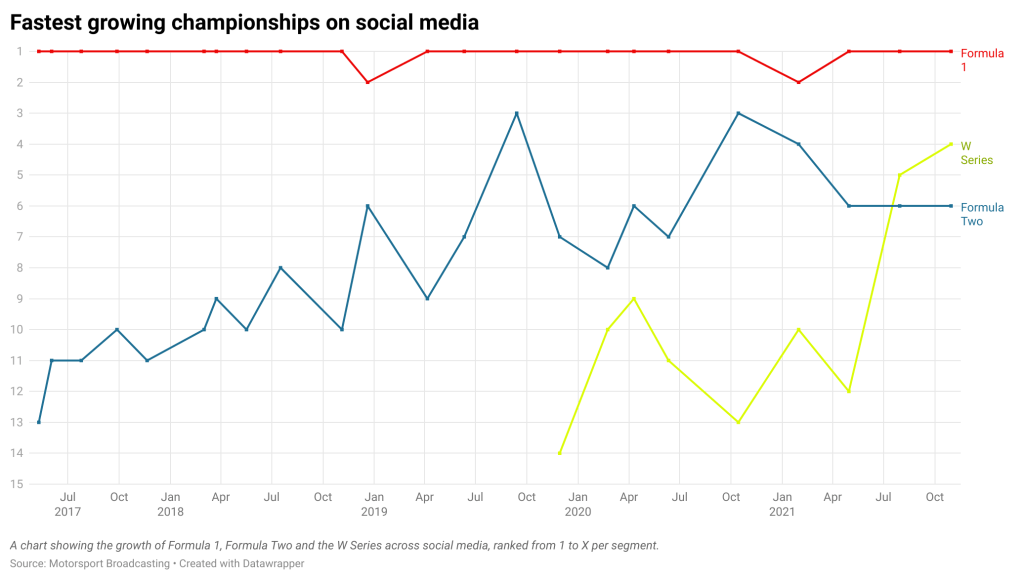 Since then, Formula Two’s reach on social media has risen faster than its rivals: gradually increasing to 8th in July 2018 and 3rd in Autumn 2019 and 2020 respectively.