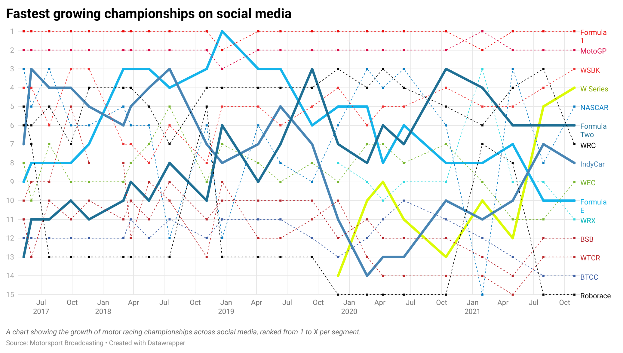 As expected, Formula 1 has led the way, only briefly dipping behind their nearest rival twice. Formula E overtook F1 in the back end of 2018, with MotoGP doing the same two years later.