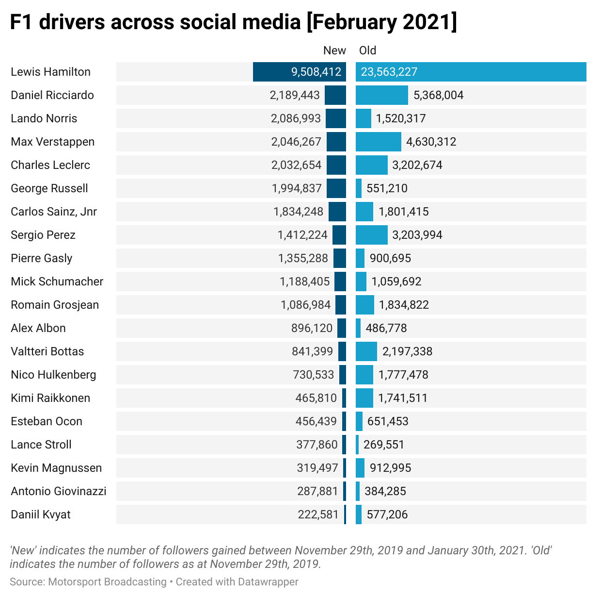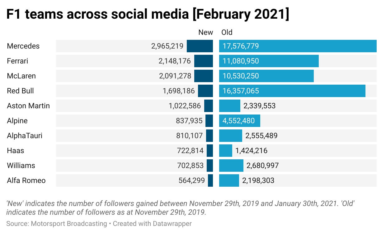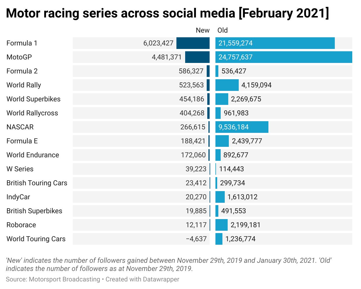 As expected, Formula 1 has led the way, only briefly dipping behind their nearest rival twice. Formula E overtook F1 in the back end of 2018, with MotoGP doing the same two years later.